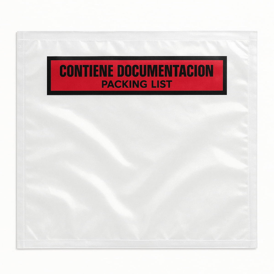 Sobre transparente para packing list con franja roja y texto 'Contiene documentación / Packing List', ideal para adjuntar documentos de envío en cajas y paquetes